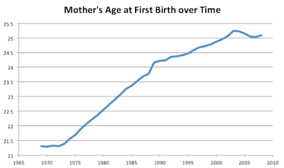 The average age has increased from 21.3 years in 1969 to 25.1 years in 2008. Using more complex queries, one could analyze the factors which have contributed to this increase, i.e. whether it can be explained by changing racial/ethnic composition of the population.