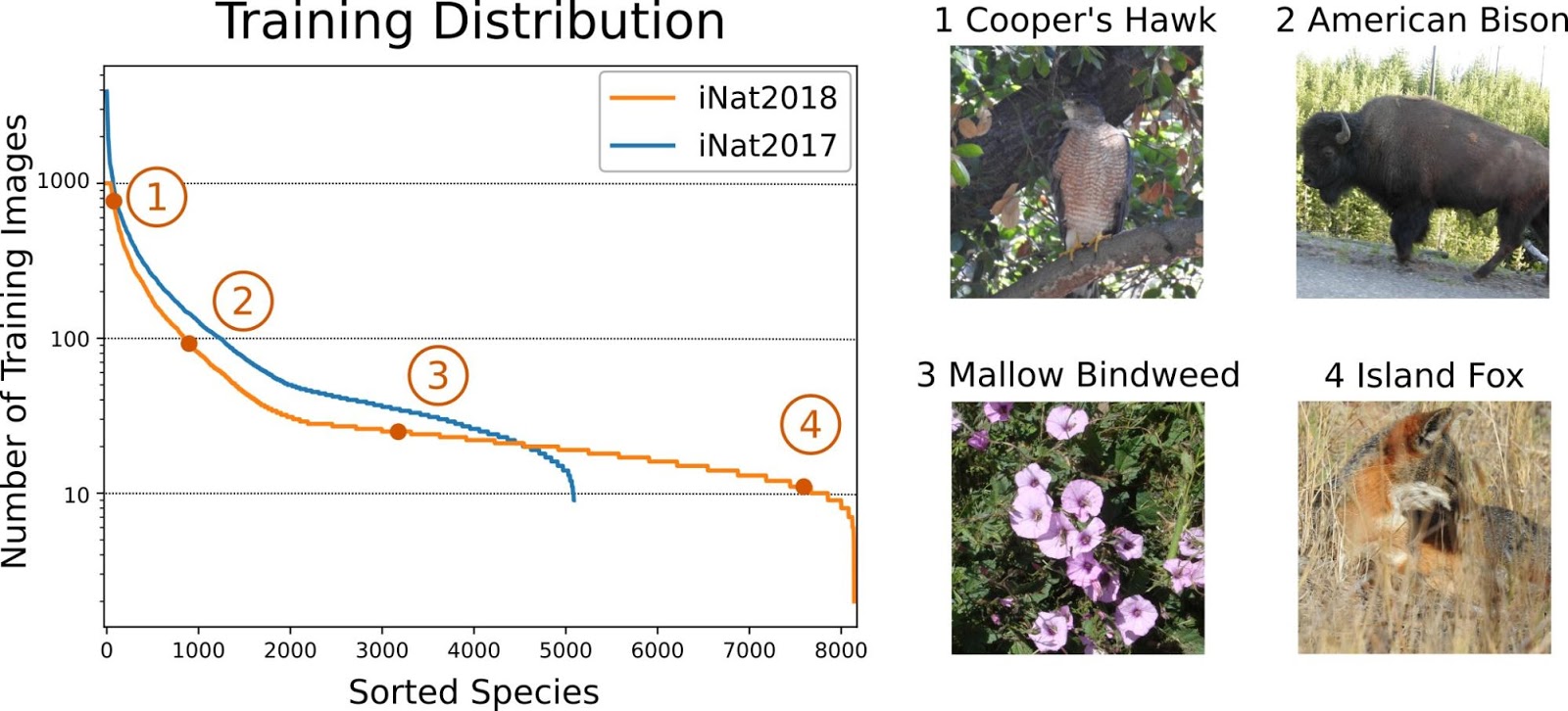 In contrast to other image classification datasets such as ImageNet, the dataset in the iNaturalist challenge exhibits a long-tailed distribution, with many species having relatively few images. It is important to enable machine learning models to handle categories in the long-tail, as the natural world is heavily imbalanced – some species are more abundant and easier to photograph than others. The iNaturalist challenge will encourage progress because the training distribution of iNat-2018 has an even longer tail than iNat-2017.