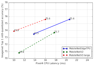 MobileNetEdgeTPU when running on a mobile CPU delivers inferior performance compared with the models that have been tuned specifically for mobile CPUs (MobileNetV3). MobileNetEdgeTPU models perform a much greater number of operations, and so, it is not surprising that they run slower on mobile CPUs, which exhibit a more linear relationship between a model’s compute requirements and the runtime.