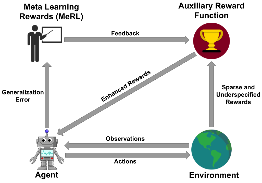 The key insight of MeRL in dealing with underspecified rewards is that spurious trajectories and programs that achieve accidental success are detrimental to the agent's generalization performance. For example, an agent might be able to solve a specific instance of the maze problem above. However, if it learns to perform spurious actions during training, it is likely to fail when provided with unseen instructions. To mitigate this issue, MeRL optimizes a more refined auxiliary reward function, which can differentiate between accidental and purposeful success based on features of action trajectories. The auxiliary reward is optimized by maximizing the trained agent's performance on a hold-out validation set via meta learning.