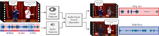 In “Looking to Listen at the Cocktail Party”, to appear in SIGGRAPH 2018 this summer, we present a deep learning audio-visual model for isolating a single speech signal from a mixture of sounds such as other voices and background noise. In this work, we are able to computationally produce videos in which speech of specific people is enhanced while all other sounds are suppressed. Our method works on ordinary videos with a single audio track, and all that is required from the user is to select the face of the person in the video they want to hear, or to have such a person be selected algorithmically based on context. We believe this capability can have a wide range of applications, from speech enhancement and recognition in videos, through video conferencing, to improved hearing aids, especially in situations where there are multiple people speaking.