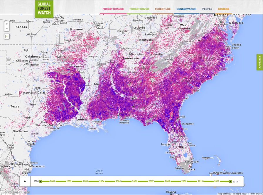 The Southern United States is home to the nation’s most heavily forested region, making up 29 percent of the total U.S. forest land. Interestingly, the majority of this region is “production forests.” The mosaic of loss (pink) and gain (blue) in the above map shows how forests throughout this region are used as crops – grown and harvested in five-year cycles to produce timber or wood pulp for paper production.