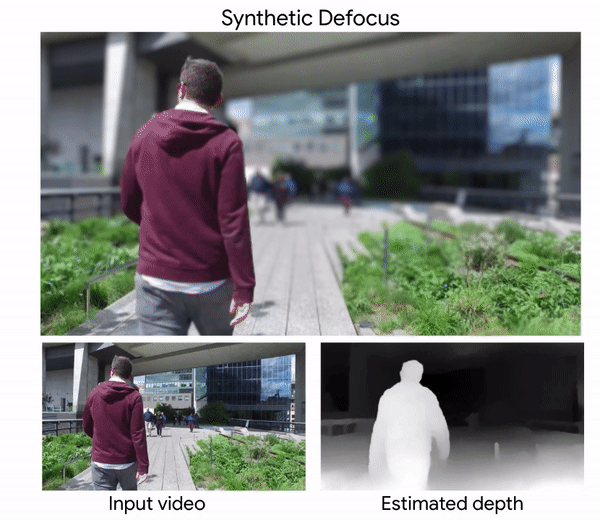 Our predicted depth maps can be used to produce a range of 3D-aware video effects. One such effect is synthetic defocus. Below is an example, produced from an ordinary video using our depth map.
