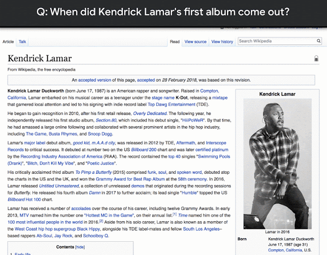 Our paper "Natural Questions: a Benchmark for Question Answering Research", which has been accepted for publication in Transactions of the Association for Computational Linguistics, has a full description of the data collection process. To see some more examples from the dataset, please check out the NQ website.