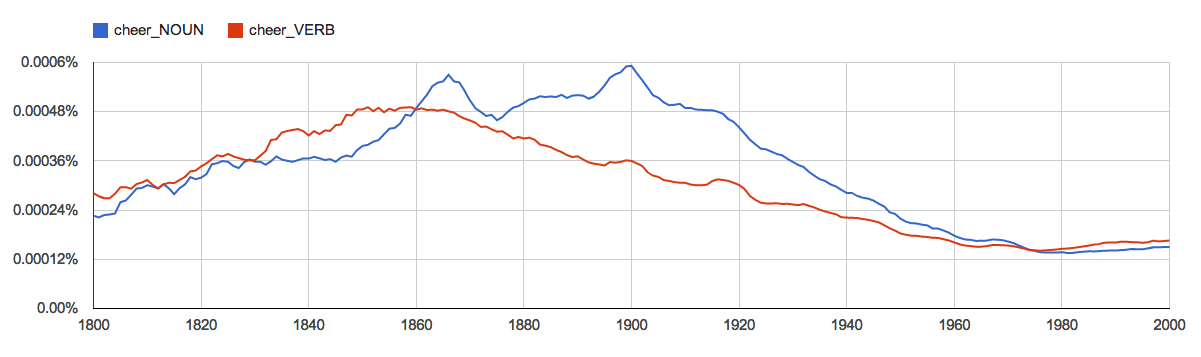At Google, we’re also trying to understand the meaning behind what people write, and to do that it helps to understand grammar. Last summer Slav Petrov of Google’s Natural Language Processing group and his intern Yuri Lin (who’s since joined Google full-time) built a system that identified parts of speech—nouns, adverbs, conjunctions and so forth—for all of the words in the millions of Ngram Viewer books. Now, for instance, you can compare the verb and noun forms of “cheer” to see how the frequencies have converged over time: