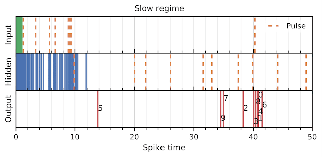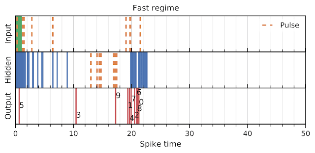While training the spiking network on MNIST, we observed the neural network spontaneously shift between two operating regimes. Early during training, the network exhibited a slow and highly accurate regime, where almost all neurons fired before the network made a decision. Later in training, the network spontaneously shifted into a fast but slightly less accurate regime. This behaviour was intriguing, as we did not optimize for it explicitly. Thus spiking networks can, in a sense, be “deliberative”, or make a snap decision on the spot. This is reminiscent of the trade-off between speed and accuracy in human decision-making.