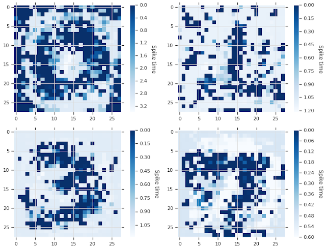 Based on this biological insight, project Ihmehimmeli explores how artificial spiking neural networks can exploit temporal dynamics using various architectures and learning settings. “Ihmehimmeli” is a Finnish tongue-in-cheek word for a complex tool or a machine element whose purpose is not immediately easy to grasp. The essence of this word captures our aim to build complex recurrent neural network architectures with temporal encoding of information. We use artificial spiking networks with a temporal coding scheme, in which more interesting or surprising information, such as louder sounds or brighter colours, causes earlier neuronal spikes. Along the information processing hierarchy, the winning neurons are those that spike first. Such an encoding can naturally implement a classification scheme where input features are encoded in the spike times of their corresponding input neurons, while the output class is encoded by the output neuron that spikes earliest.