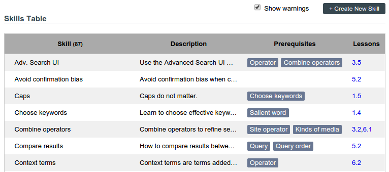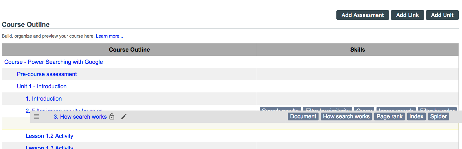 You can now define prerequisites and skills learned for each lesson. For instance, in a course about arithmetic, addition might be a prerequisite for the lesson on multiplying numbers, while multiplication is a skill learned. Once an instructor has defined the skill relationships, they will have a consolidated view of all their skills and the lessons they appear in, such as this list for Power Searching with Google: