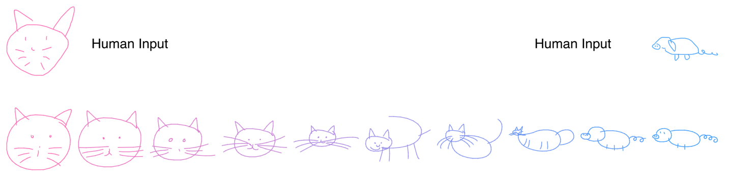 We would also like to know if our model can learn representations of multiple animals, and if so, what would they look like? In the figure below, we generate sketches from interpolating latent vectors between a cat head and a full pig. We see how the representation slowly transitions from a cat head, to a cat with a tail, to a cat with a fat body, and finally into a full pig. Like a child learning to draw animals, our model learns to construct animals by attaching a head, feet, and a tail to its body. We see that the model is also able to draw cat heads that are distinct from pig heads.